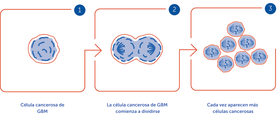 Por lo general, un tumor no tratado sigue creciendo cuando las células cancerosas de GBM se dividen y crean más células. Cuando una célula de GBM se divide, crea una figura de reloj de arena que se separa en 2 células idénticas.